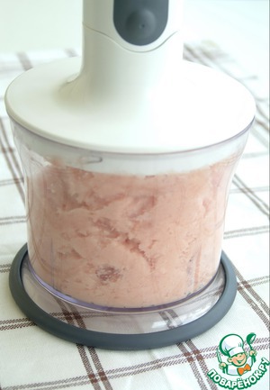 Бедра (красное мясо) нарезать блендером мелко, но чтобы остались маленькие кусочки, тогда их будет хорошо видно в разрезе, как на финальном фото. -