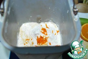 В ёмкость для замеса добавляем цедру и сок апельсина.