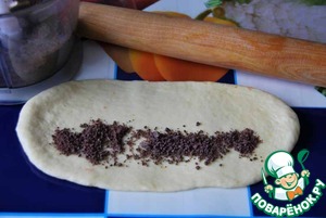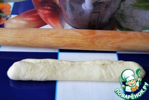 Берём кусочек теста и раскатываем его в широкую полоску. Если тесто липнет, присыпьте мукой.