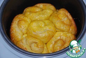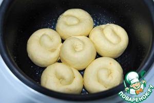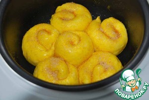 Берём чашу мультиварки, смазываем маслом, укладываем в неё неплотно полуфабрикаты булочек-завитки.
