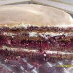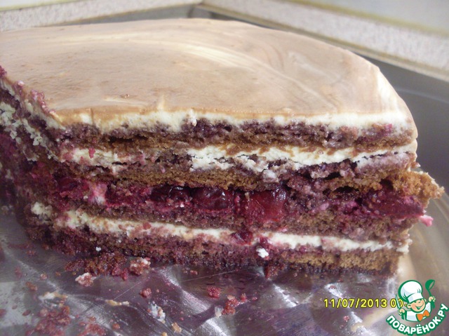 3. Каждый корж пропитайте вишневым соком, смажьте толстым слоем крема и проложите ягодами вишни (замороженную вишню предватительно рзморозить).
