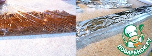 Выложить смесь на полиэтиленовую плёнку, равномерно распределить, что бы получалась длинная полоса.