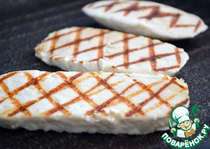 Разогреть гриль, выложить сыр, жарить с каждой стороны до появления красивого характерного "узора".