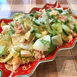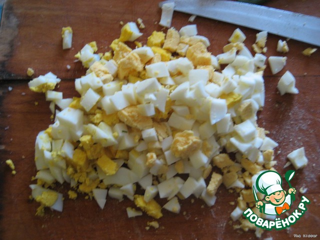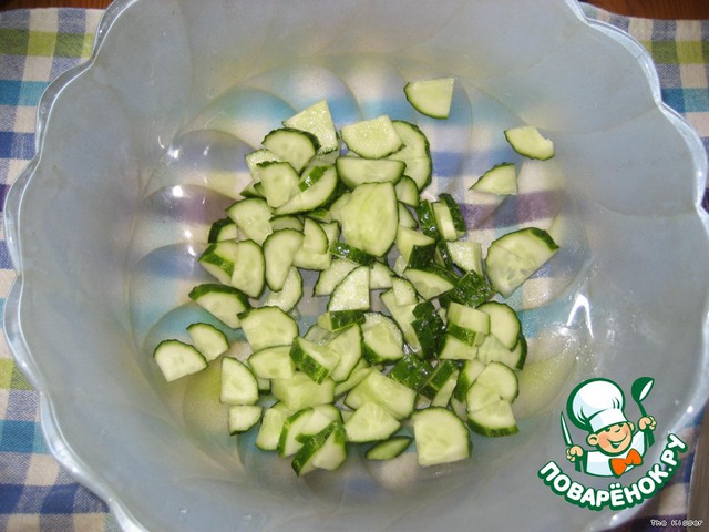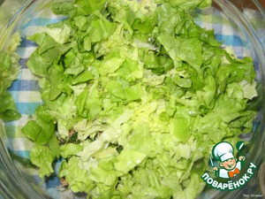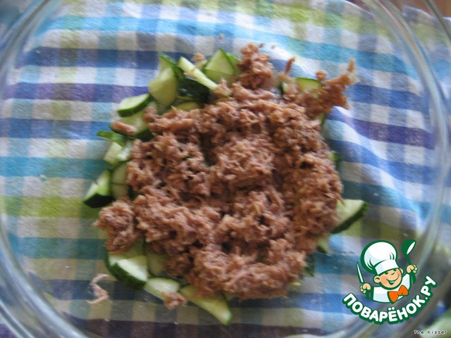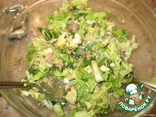 Режем салат и выливаем из банки из под тунца масло, либо добавляем своё подсолнечное масло