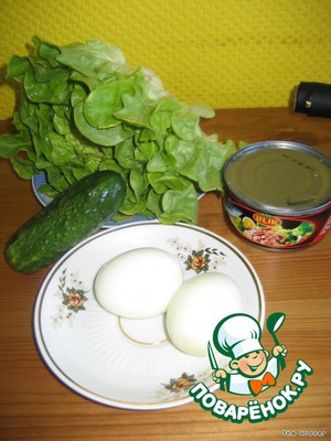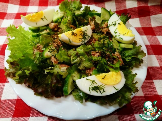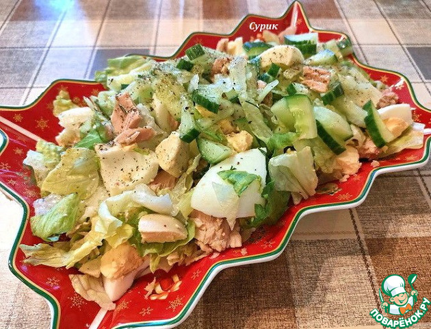 Вкусный рыбный салат, готовится очень быстро. В холодильнике для салата всегда всe найдется. За финальное фото к рецепту спасибо Катерине kotenochkin.
