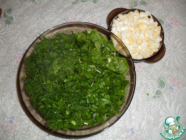 Режем яйца, щавель, лук и укроп.