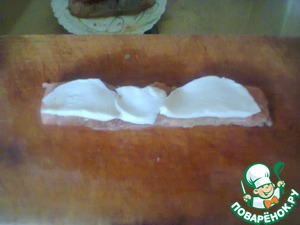 Теперь вернёмся к нашей рыбе. Взять сыр моцарелла, разрезать его на пластинки и уложить на подготовленные полоски рыбы.