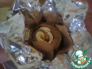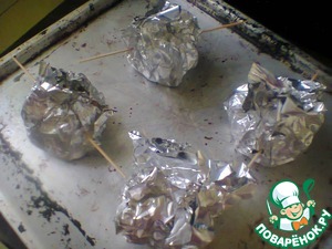 Подготовить точно так же остальные порции блюда. Перенести на противень. Закрыть корзиночки из фольги и отправить в разогретую духовку. (Кстати, на этом фото во всей красе видно бамбуковые шпажки.)