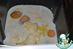 В ведерко ХП закладываем ингредиенты согласно вашей инструкции. У меня: дрожжи, мука, соль, сахар, ванилин, маргарин, яйца, молоко.