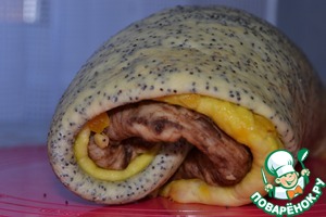 Раскатываем коржи толщиной 5-6 мм. И складываем друг на друга (корж с курагой положить посередине). Сворачиваем рулетом и убираем в смазанную маслом форму, швом вниз. Ставим на расстойку в теплое место на 30-35 мин.