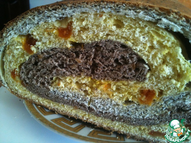 Оригинальный десертный хлеб с маком, курагой, какао и орехами, который получается слоями. Хлеб высокий, ароматный. Смотрите сами.