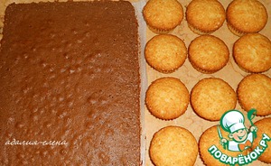 Далее подготовить шоколадный корж, используя половину ингредиентов для капкейков, и плюс 2 ст. л. какао. Тесто выложить выпекаться на противень, но не плоский, а со стенками высотой 3-4 см. Выпекать при 180*С примерно 15 мин. -