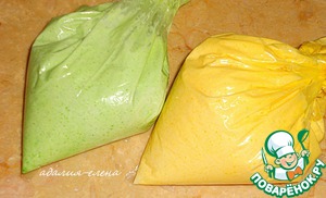 Подготовить крем: сливочное масло взбить с сахарной пудрой, молоком и ванилином. Разделить крем на 2 части: в одну часть добавить зеленый краситель, в другую - желтый.