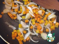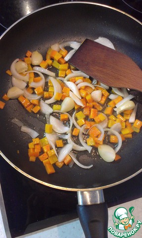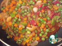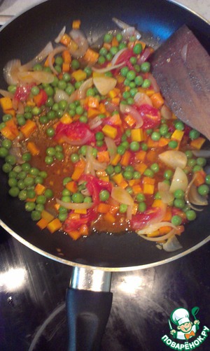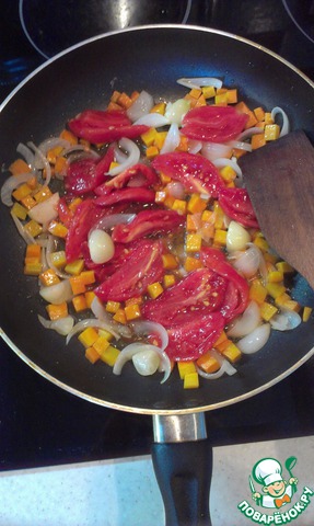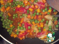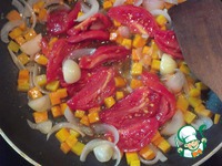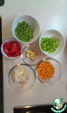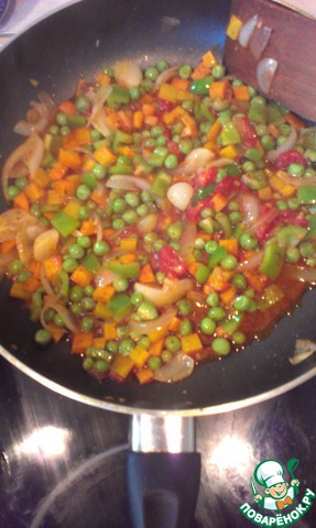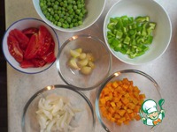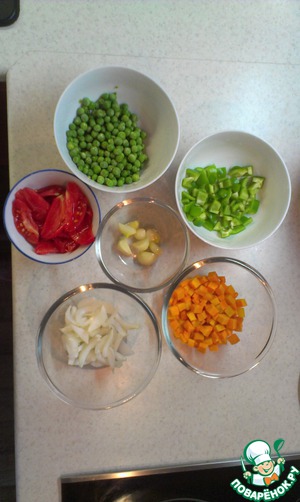 1. нарезаем овощи: морковь - кубиками, перец болгарский - кубиками, лук - полукольцами, помидор тоже полукольцами