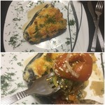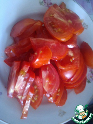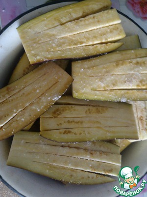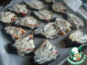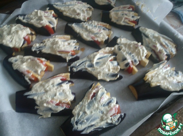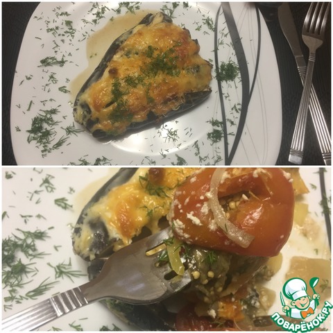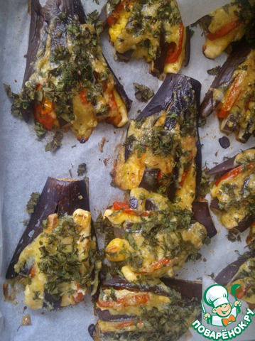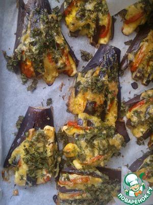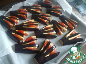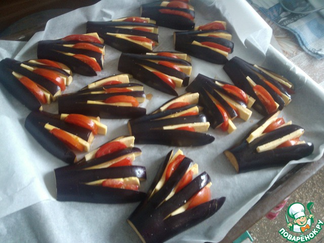 В "щели" баклажана выкладываем сыр и помидор, проделываем это с каждой половинкой