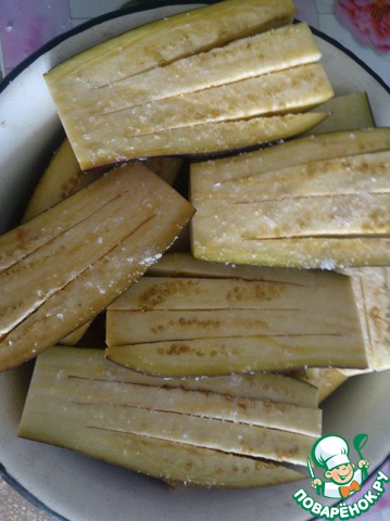 Баклажаны моем, режем пополам и каждую половинку надрезаем еще на несколько частей, оставляя край один целым.