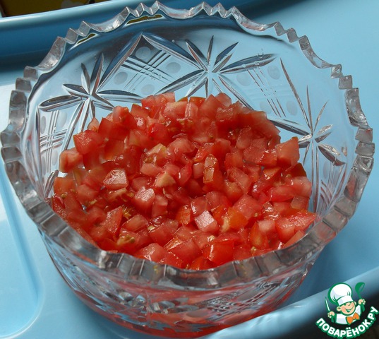 1 слой: Помидоры режем на кубики и выкладываем на дно салатника. -