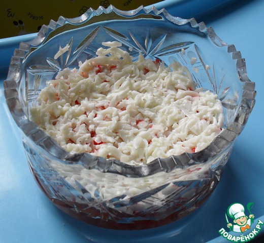 3 слой: Белки трем на крупной терке и выкладываем на крабовые палочки. -
