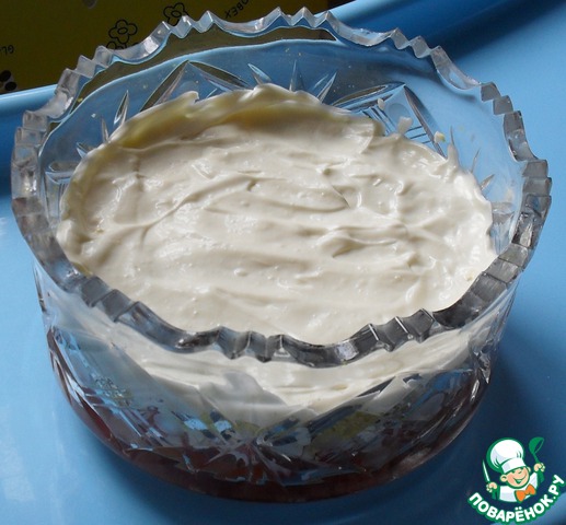 5 слой: Майонез кладем на желтки и равномерно распределяем по всей поверхности.