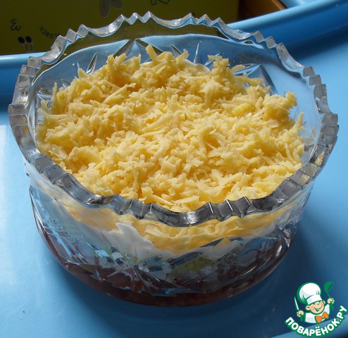 6 слой: Сыр трем на крупной терке и выкладываем на слой майонеза.