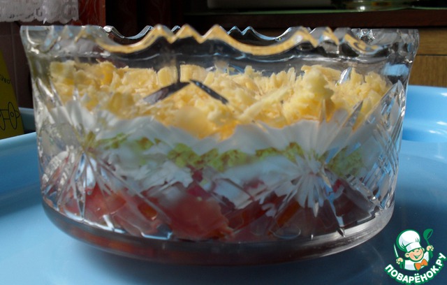 Желательно готовить салат в прозрачной гладкой ёмкости, чтобы были видны слои - сбоку салат выглядит как мозаика.
