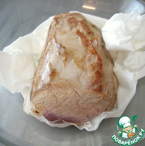Тем временем, на выше среднего огне обжарить свинину со всех сторон до золотистой корочки на смеси сливочного (15 г) и растительного масел. Внутри мясо не должно быть готовым. Отложить его на влаговпитывающую салфетку.