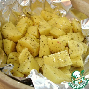 Тем временем картофель (600 гр) чистим, крупно нарезаем, смешиваем с солью, прованскими травами (по вкусу) и 2 ст. л. растительного масла, помещаем его в другую форму и отправляем в духовку к мясу.