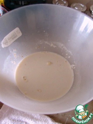 Подогреваем молоко, разводим в нем дрожжи, добавляем столовую ложку сахара и муки. Ждем, пока смесь запузырится.