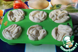 И аккуратно в каждое отверстие уголками вниз вкладываем по три полуфабриката. Не нужно укладывать их плотно или давить. -