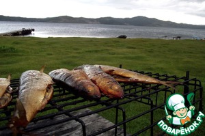 Вкусный, сочный омуль горячего копчения на берегу оз. Байкал. Покупали его тут же, у местных рыбаков. Можно использовать и любую другую рыбу (сельдь, скумбрия).