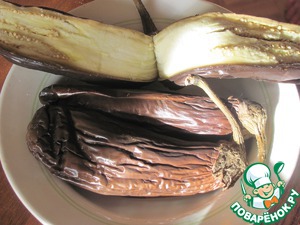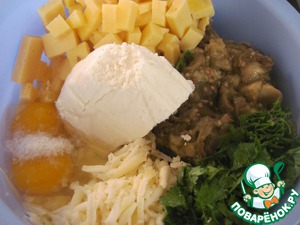 Баклажаны остудить и достать ложкой мякоть. Размять её вилкой и добавить к начинке. Всё хорошо перемешать и по вкусу подсолить (солите осторожно, т. к. адыгейский сыр соленоват).