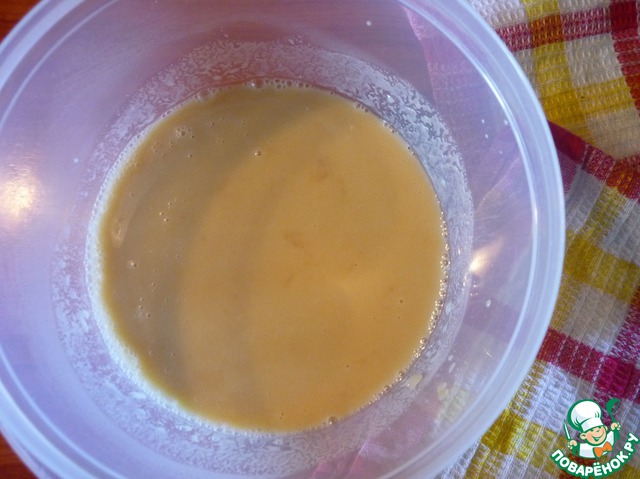 Смешать фруктовое пюре, дрожжи, щепотку соли, теплое молоко и 100 гр муки. Оставить в тепле до появления "шапочки".