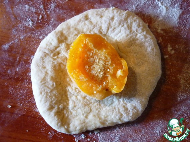 Положить на серединку каждой лепешки абрикос, посыпать его сахаром. -
