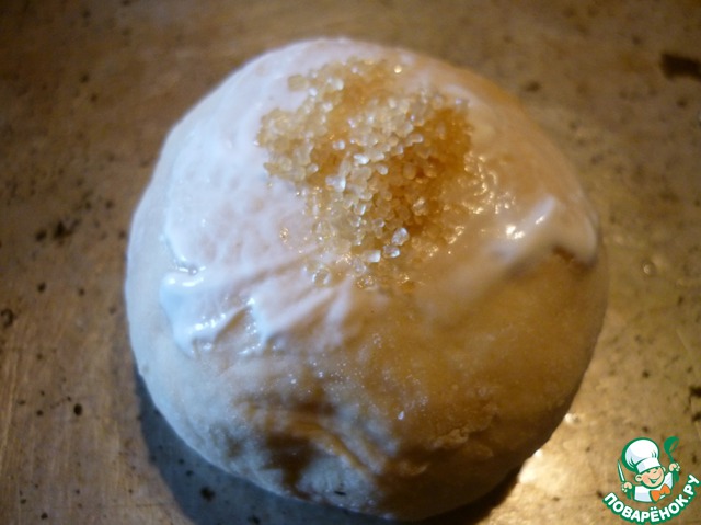 Хорошо скрепить края и придать форму булочки. Смазать булочку молоком и посыпать сахаром.