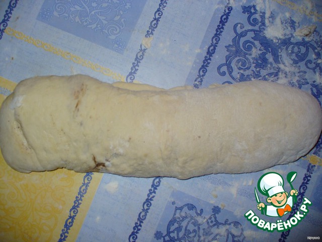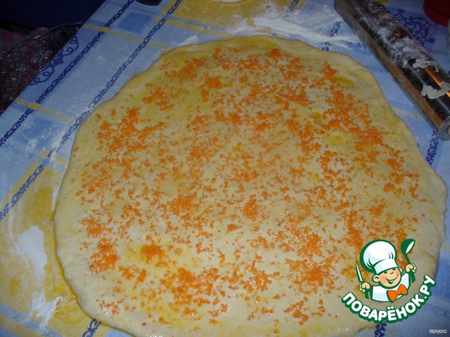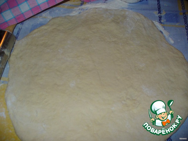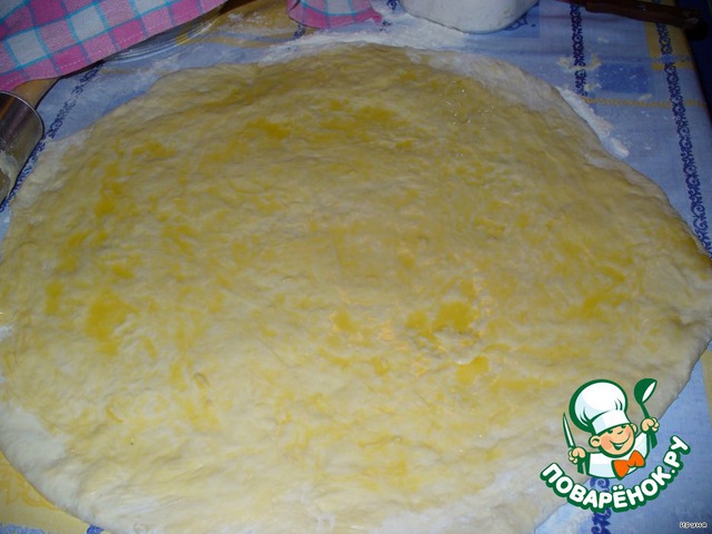 Тесто хорошо вымесить и поставить в теплое место. По мере поднятия обминать руками, смоченными в растительном масле. Обмять надо 2 раза, на третий приступаем к приготовлению плюшек. Я взяла половину теста и раскатала в пласт.