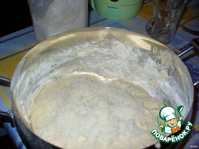 Сверху НА МУКУ вылить дрожжи. Теперь можно все перемешать. Вымешиваем тесто, добавляя муку до нужной консистенции. В процессе замеса добавить натертый на мелкой терке отварной картофель.