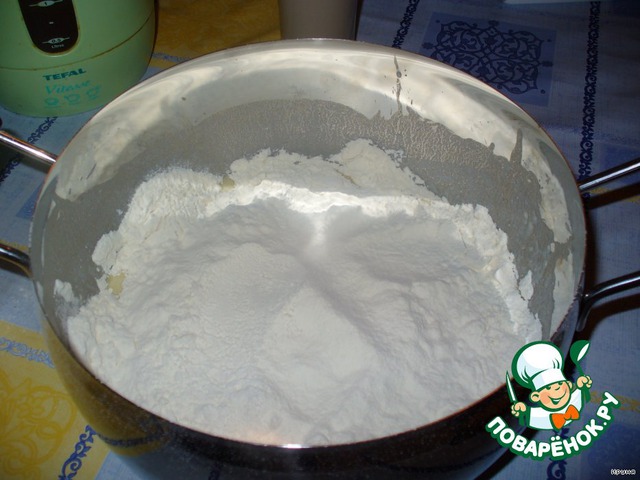 Сверху насыпать муку по всей поверхности масла и НЕ ПЕРЕМЕШИВАТЬ!