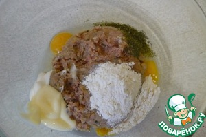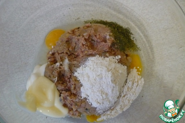 Филе рыбы пропустить через мясорубку с крупной ячейкой. Добавить яйца, муку, укроп, майонез, масло, соду, соль. Перемешиваем фарш. Если он очень плотный, добавляем водичку.