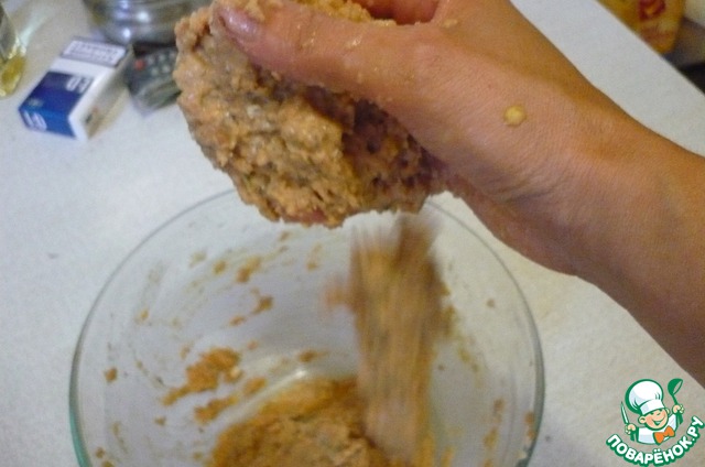 Если вы переборщили с водой и фарш получился слегка жидковат, то не надо добавлять муку или что в этом роде. Просто смочите руку водой, опустите в сухари и прямо на руке формируйте котлетку, посыпая сухарями.