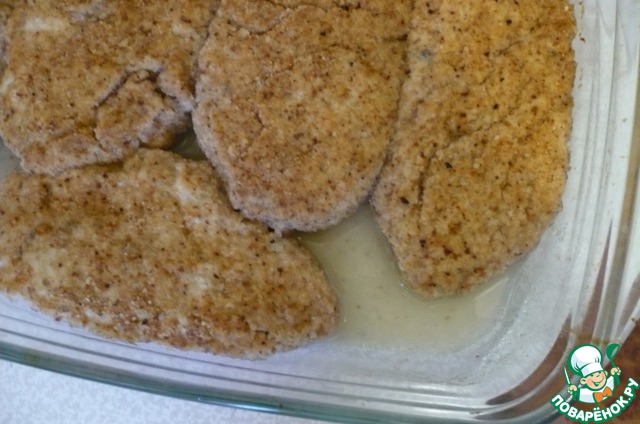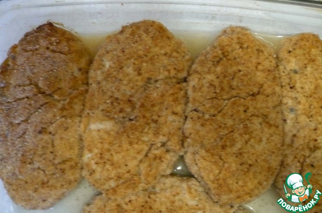 Ставим в духовку при t=180 на 3 мин. Через 3 минут трогаем котлеты. Если они стали плотными, добавляем воду, так, чтобы не пригорели, накрываем крышкой и держим еще в духовке 15 мин.