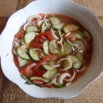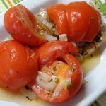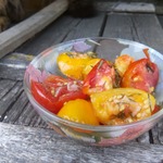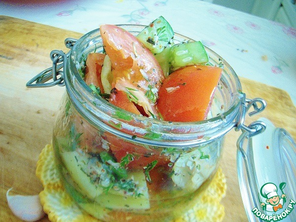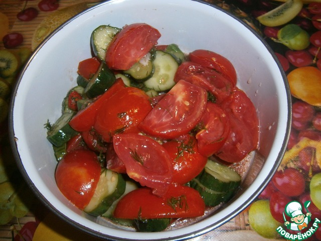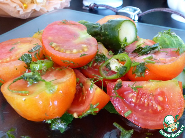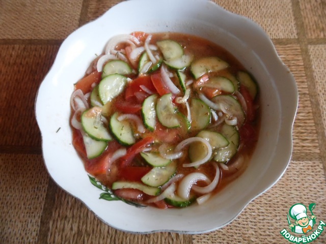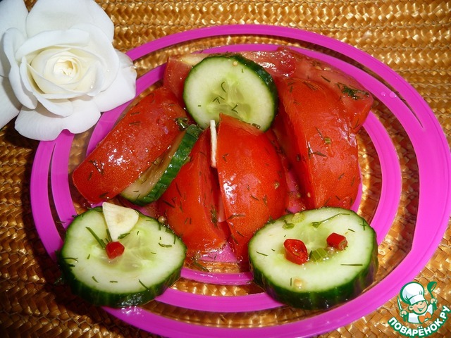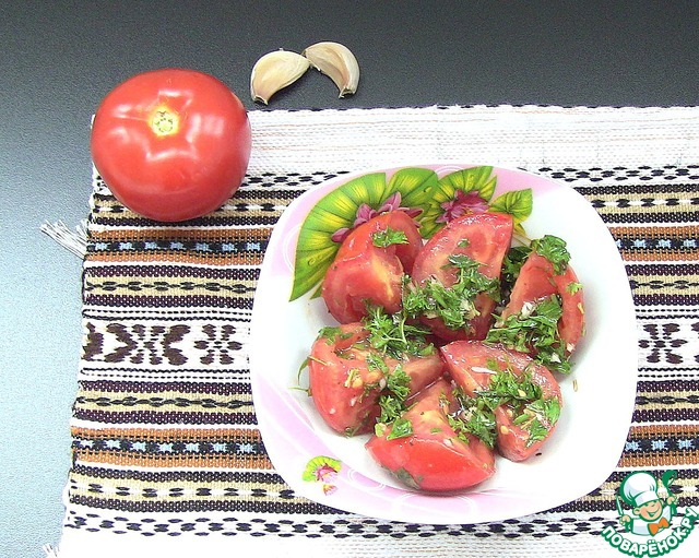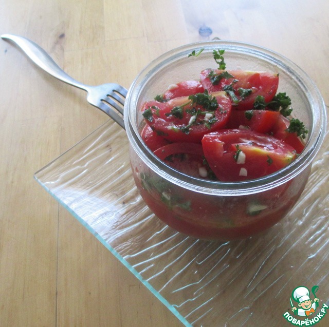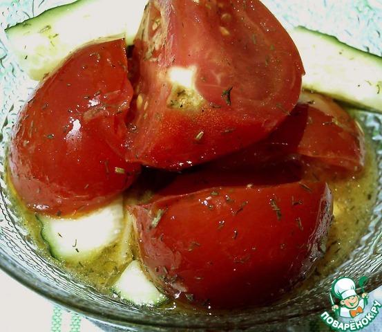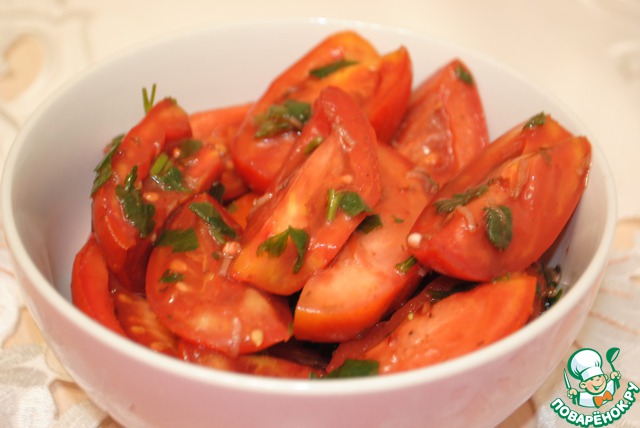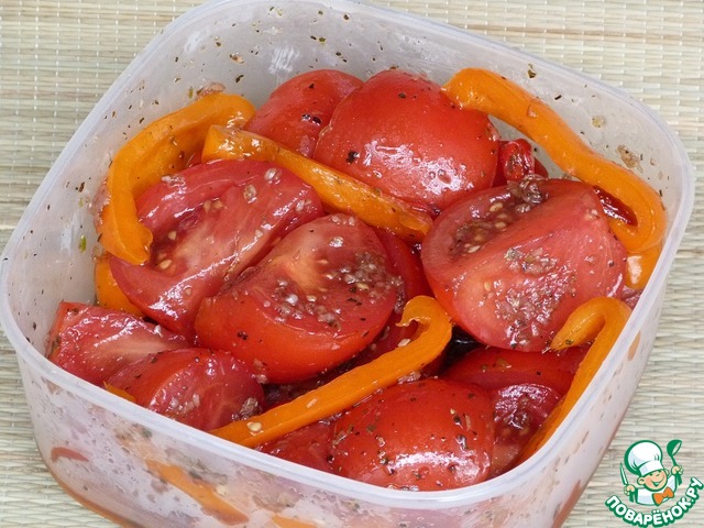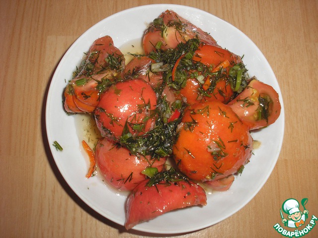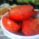 В воскресенье собрались на реку, у нас жара стоит почти +40. С вечера начала готовить, так как разводить костер даже в мангале чревато последствиями. Хотела взять с собой соленую помидору, но оказалось, что все припасы с ней уже приговорили. Пришлось прошерстить инет, и там я нашла этот рецепт. Знаете, нам всем очень понравилось. Попробуйте, хорошо выручает, когда засолка кончилась.