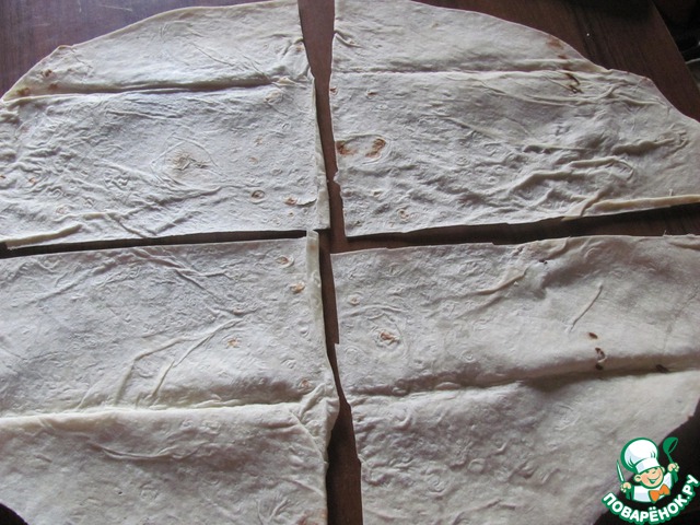 Теперь займёмся лавашем. У меня 2 больших лаваша. Я его разрезала на 4 части, и всего у меня вышло 8 частей.