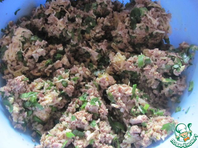 Зелень измельчить и высыпать в миску. Фарш посолить и поперчить, добавить 2 желтка и перемешать. Наш фарш готов!