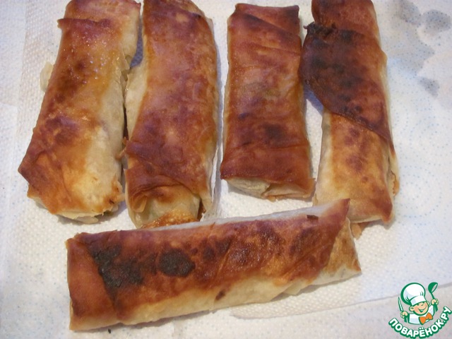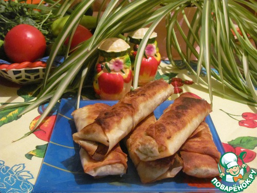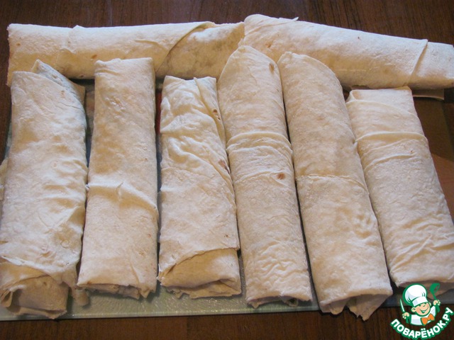 На край лаваша выкладываем начинку и заворачиваем в виде "сигар", смазывая кончики белком. Вот такие 8 "сигар" у нас получилось.
