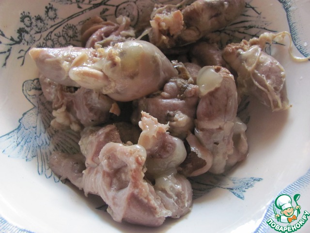 Желудочки и сердечки промываем и отвариваем в подсоленной воде до готовности 30-40 мин.