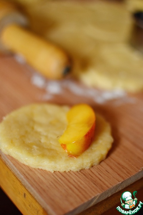 Итак, тесто разделить на 2 части. Одну оставить прохлаждаться в холодильнике, а другую раскатать толщиной 1 см и вырезать круги диаметром 7 см. Присыпать каждый кружок мелким сахаром и положить на один край подготовленную дольку нектарина. Закрыть другим краем. Всё. -