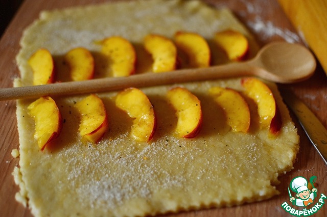 Тесто так же раскатываем толщиной 1 см, стараясь получить прямоугольник, мысленно делим его пополам по широкой части. Я для пущей наглядности положила на место "мысленно пополам" деревянную ложку. :))) Посыпаем тесто сахаром (без фанатизма). У меня ушла 1 полная столовая ложка. По обе стороны "мысленнопополамной" линии выкладываем дольки персиков. -