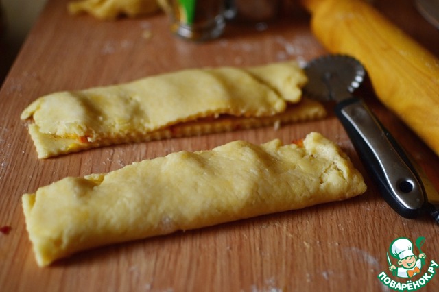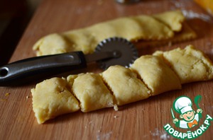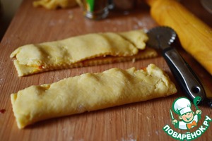 Разрезаем тесто сначала вдоль, затем на порционные кусочки.