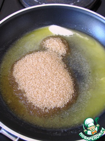 • Добавляем коричневый сахар "Мистраль" Демерара. На небольшом огне расплавляем сахар, помешивая. Доводим до состояния карамели. Следим, чтобы сильно не загустела и не подгорела.