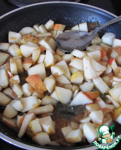 • Добавляем яблоки и ванилин, коньяк, держим на огне еще примерно 5-7 минут, чтобы яблоки слегка размягчились.